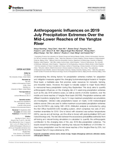 Anthropogenic influences on 2019 July precipitation extremes over the mid-lower reaches of the Yangtze River.