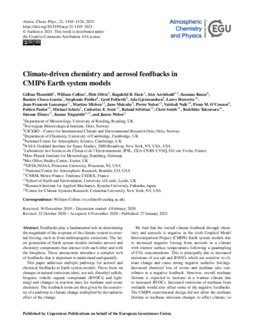 Thornhill, G., Collins, B. orcid id iconORCID: https://orcid.org/0000-0002-7419-0850, Olivie, D., Skeie, R., Archibald, A., Bauer, S., Checa-Garcia, R., Fiedler, S., Folberth, G., Gjermundsen, A., Horowitz, L., Lamarque, J.-F., Michou, M., Mulcahy, J., Nabat, P., Naik, V., O'Connor, F. O.'C., Paulot, F., Schulz, M., Scott, C. E., Seferian, R., Smith, C., Takemura, T., Tilmes, S., Tsigaridis, K. and Weber, J. (2021) Climate-driven chemistry and aerosol feedbacks in CMIP6 Earth system models. Atmospheric Chemistry and Physics, 21 (2). pp. 1105-1126. ISSN 1680-7316 doi: 10.5194/acp-21-1105-2021