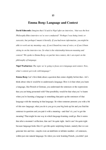 Emma Borg discusses the relationship between linguistic meaning and context, and talks about her own view, called 'Semantic Minimalism', in this Philosophy Bites interview, conducted by David Edmonds and Nigel Warburton.