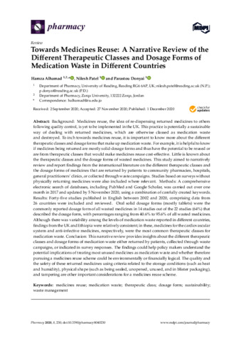 Alhamad, H., Patel, N. orcid id iconORCID: https://orcid.org/0000-0002-8600-0663 and Donyai, P. orcid id iconORCID: https://orcid.org/0000-0001-5403-6170 (2020) Towards medicines reuse: a narrative review of the different therapeutic classes and dosage forms of medication waste in different countries. Pharmacy, 8 (4). 230. ISSN 2226-4787 doi: 10.3390/pharmacy8040230