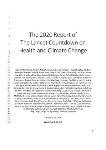 The Lancet Countdown is an international collaboration established to provide an independent, global monitoring system dedicated to tracking the emerging health profile of the changing climate. The 2020 report presents 43 indicators across five sections: climate change impacts, exposures, and vulnerabilities; adaptation, planning, and resilience for health; mitigation actions and health co-benefits; economics and finance; and public and political engagement. This report represents the findings and consensus of the 35 leading academic institutions and UN agencies that make up The Lancet Countdown, and draws on the expertise of climate scientists, geographers, engineers, experts in energy, food, and transport, economists, social, and political scientists, data scientists, public health professionals, and doctors.