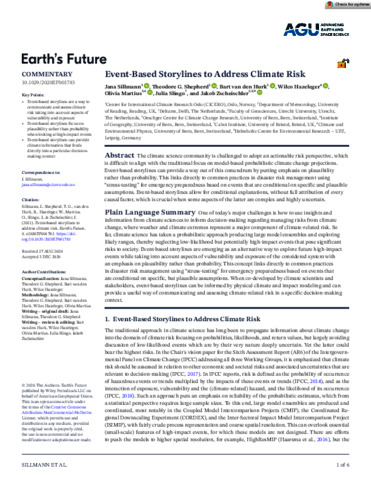 The climate science community is challenged to adopt an actionable risk perspective, which is difficult to align with the traditional focus on model-based probabilistic climate change projections. Event-based storylines can provide a way out of this conundrum by putting emphasis on plausibility rather than probability. This links directly to common practices in disaster risk management using “stress-testing” for emergency preparedness based on events that are conditional on specific and plausible assumptions. Event-based storylines allow for conditional explanations, without full attribution of every causal factor, which is crucial when some aspects of the latter are complex and highly uncertain.