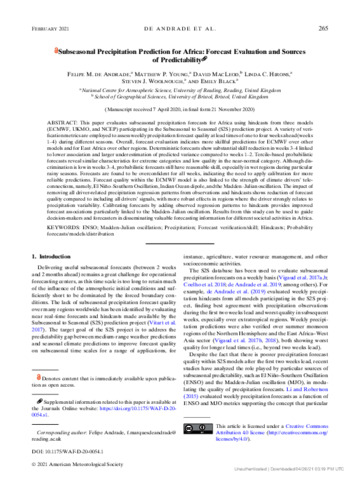 de Andrade, F. M., Young, M. P., MacLeod, D., Hirons, L. C. orcid id iconORCID: https://orcid.org/0000-0002-1189-7576, Woolnough, S. J. orcid id iconORCID: https://orcid.org/0000-0003-0500-8514 and Black, E. orcid id iconORCID: https://orcid.org/0000-0003-1344-6186 (2021) Subseasonal precipitation prediction for Africa: forecast evaluation and sources of predictability. Weather and Forecasting, 36 (1). pp. 265-284. ISSN 0882-8156 doi: 10.1175/WAF-D-20-0054.1