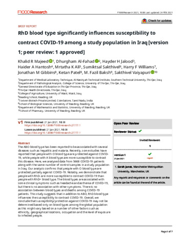 Majeed, K. R., Al-Fahad, D., Jalood, H. H., Hantosh, H. A., Ali, M. K., Sakthivel, S., Williams, H. F., Gibbins, J. M. orcid id iconORCID: https://orcid.org/0000-0002-0372-5352, Patel, K., Baksh, M. F. orcid id iconORCID: https://orcid.org/0000-0003-3107-8815 and Vaiyapuri, S. orcid id iconORCID: https://orcid.org/0000-0002-6006-6517 (2021) RhD blood type significantly influences susceptibility to contract COVID-19 among a study population in Iraq. F1000Research. ISSN 2046-1402 doi: 10.12688/f1000research.27777.1