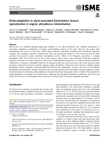 Lidbury, I. D. E. A. orcid id iconORCID: https://orcid.org/0000-0001-7190-315X, Borsetto, C. orcid id iconORCID: https://orcid.org/0000-0003-4848-9522, Murphy, A. R. J., Bottrill, A. orcid id iconORCID: https://orcid.org/0000-0002-5182-3643, Jones, A. M. E., Bending, G. D., Hammond, J. P. orcid id iconORCID: https://orcid.org/0000-0002-6241-3551, Chen, Y. orcid id iconORCID: https://orcid.org/0000-0002-0367-4276, Wellington, E. M. H. and Scanlan, D. J. orcid id iconORCID: https://orcid.org/0000-0003-3093-4245 (2020) Niche-adaptation in plant-associated Bacteroidetes favours specialisation in organic phosphorus mineralisation. ISME Journal. ISSN 1751-7370 doi: 10.1038/s41396-020-00829-2