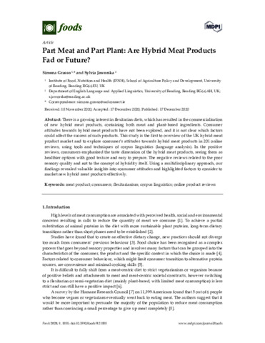Grasso, S. orcid id iconORCID: https://orcid.org/0000-0001-6089-864X and Jaworska, S. orcid id iconORCID: https://orcid.org/0000-0001-7465-2245 (2020) Part meat and part plant: are hybrid meat products fad or future? Foods, 9 (12). 1888. ISSN 2304-8158 doi: 10.3390/foods9121888