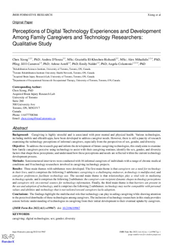 Xiong, C., D'Souza, A., El-Khechen-Richandi, G., Mihailidis, A., Camerona, J. I., Astell, A. orcid id iconORCID: https://orcid.org/0000-0002-6822-9472, Nalder, E. and Colantonio, A. (2022) Perceptions of technology experiences and development among family caregivers and technology researchers: qualitative study. JMIR Formative Research, 6 (1). e19967. ISSN 2561-326X doi: 10.2196/19967