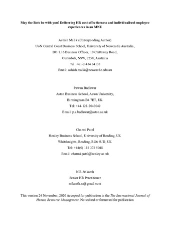 Malik, A., Budhwar, P., Patel, C. and Srikanth, N. R. (2022) May the bots be with you! Delivering HR cost-effectiveness and individualised employee experiences in an MNE. The International Journal of Human Resource Management, 33 (6). pp. 1148-1178. ISSN 1466-4399 doi: 10.1080/09585192.2020.1859582