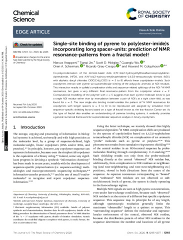 Knappert, M., Jin, T., Midgley, S. D., Wu, G., Scherman, O., Grau-Crespo, R. orcid id iconORCID: https://orcid.org/0000-0001-8845-1719 and Colquhoun, H. M. (2020) Single-site binding of pyrene to poly(ester-imide)s incorporating long spacer-units: prediction of NMR resonance-patterns from a fractal model. Chemical Science, 11 (44). pp. 12165-12177. ISSN 1478-6524 doi: 10.1039/d0sc03730c