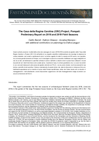 This article summarizes the first two seasons of archaeological fieldwork (June–July 2018, June–July 2019) in the garden of the large Pompeian house known as the Casa della Regina Carolina (VIII 3.14), an elite Pompeian dwelling that saw only partial excavation in the 19th century.