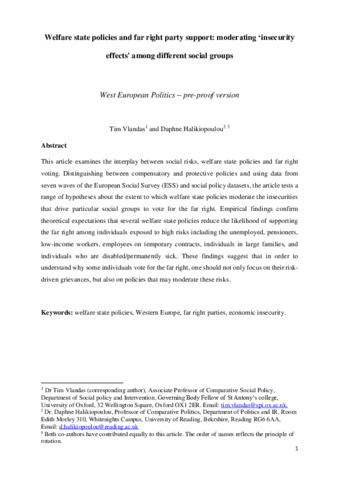 Vlandas, T. and Halikiopoulou, D. (2022) Welfare state policies and far right party support: moderating ‘insecurity effects' among different social groups. West European Politics, 45 (1). pp. 24-49. ISSN 1743-9655 doi: 10.1080/01402382.2021.1886498