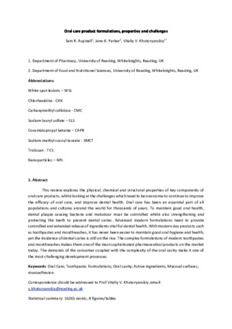 Aspinall, S. R., Parker, J. K. orcid id iconORCID: https://orcid.org/0000-0003-4121-5481 and Khutoryanskiy, V. V. orcid id iconORCID: https://orcid.org/0000-0002-7221-2630 (2021) Oral care product formulations, properties and challenges. Colloids and Surfaces B: Biointerfaces, 200. 111567. ISSN 0927-7765 doi: 10.1016/j.colsurfb.2021.111567