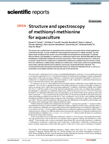 The amino acid L-methionine is an essential amino acid and is commonly used as a feed supplement in terrestrial animals. It is less suitable for marine organisms because it is readily excreted. It is also highly water soluble and this results in loss of the feed and eutrophication of the water. To address these problems, the dipeptide DL-methionyl-DL-methionine (trade name: AQUAVI Met-Met) has been developed as a dedicated methionine source for aquaculture. The commercial product is a mixture of a racemic crystal form of D-methionyl-D-methionine/L-methionyl-L-methionine and a racemic crystal form of D-methionyl-L-methionine/L-methionyl-D-methionine. In this work, we have computationally, structurally, spectroscopically and by electron microscopy characterised these materials. The microscopy and spectroscopy demonstrate that there is no interaction between the DD–LL and DL–LD racemates on any length scale from the macroscopic to the nanoscale