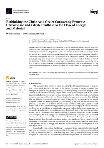 Roosterman, D. and Cottrell, G. S. orcid id iconORCID: https://orcid.org/0000-0001-9098-7627 (2021) Rethinking the Citric Acid Cycle: connecting pyruvate carboxylase and citrate synthase to the flow of energy and material. International Journal of Molecular Sciences, 22 (2). e604. ISSN 1422-0067 doi: 10.3390/ijms22020604