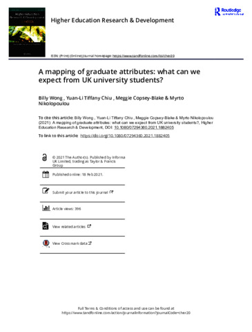 Wong, B. orcid id iconORCID: https://orcid.org/0000-0002-7310-6418, Chiu, Y. L. T., Copsey-Blake, M. and Nikolopoulou, M. (2022) A mapping of graduate attributes: what can we expect from UK university students? Higher Education Research & Development, 41 (4). pp. 1340-1355. ISSN 1469-8366 doi: 10.1080/07294360.2021.1882405