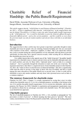 This article suggests that the “relief of those in need because of financial hardship” (Charities Act 2011, s. 3(1)(j)) is significantly wider than the “relief of poverty” in the range of those who may be helped. Nevertheless, it is likely to enjoy the same relaxed public benefit requirement as the “relief of poverty”. So, it would be charitable to assist the relatively affluent through a financially difficult period – such as the current pandemic – and this would be so even where the provision made was only for modest numbers and only for those with links to an individual business.