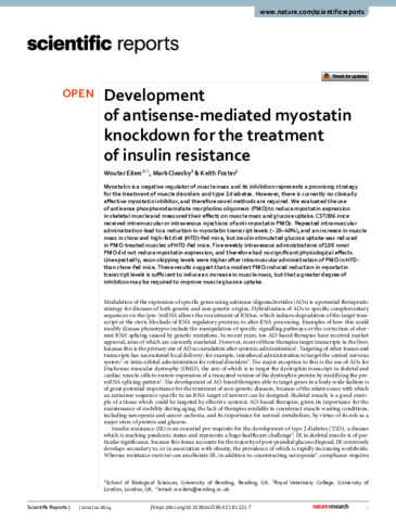 Eilers, W., Cleasby, M. and Foster, K. (2021) Development of antisense-mediated myostatin knockdown for the treatment of insulin resistance. Scientific Reports, 11 (1). 1604. ISSN 2045-2322 doi: 10.1038/s41598-021-81222-7