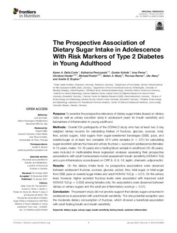 Purpose: To examine the prospective relevance of dietary sugar intake (based on dietary data as well as urinary excretion data) in adolescent years for insulin sensitivity and biomarkers of inflammation in young adulthood. Methods: Overall 254 participants of the DONALD study who had at least two 3-day weighed dietary records for calculating intakes of fructose, glucose, sucrose, total, free, added sugars, total sugars from sugar-sweetened beverages (SSB), juice, and sweets/sugar or at least two complete 24 h urine samples (n = 221) for calculating sugar excretion (urinary fructose and urinary fructose + sucrose) in adolescence (females: 9–15 years, males: 10–16 years) and a fasting blood sample in adulthood (18–36 years), were included in multivariable linear regression analyses assessing their prospective associations with adult homeostasis model assessment insulin sensitivity (HOMA2-%S) and a pro-inflammatory score (based on CRP, IL-6, IL-18, leptin, chemerin, adiponectin). Results: On the dietary intake level, no prospective associations were observed between adolescent fructose, sucrose, glucose, added, free, total sugar, or total sugar from SSB, juice or sweets/sugar intake and adult HOMA2-%S (p > 0.01). On the urinary level, however, higher excreted fructose levels were associated with improved adult HOMA2-%S (p = 0.008) among females only. No associations were observed between dietary or urinary sugars and the adult pro-inflammatory score (p > 0.01). Conclusion: The present study did not provide support that dietary sugar consumed in adolescence is associated with adult insulin sensitivity. The one potential exception was the moderate dietary consumption of fructose, which showed a beneficial association with adult fasting insulin and insulin sensitivity.