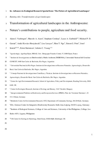 Vanbergen, A. J., Aizen, M. A., Cordeau, S., Garibaldi, L. A., Garratt, M. P. D. orcid id iconORCID: https://orcid.org/0000-0002-0196-6013, Kovács-Hostyánszki, A., Lecuyer, L., Ngo, H. T., Potts, S. G. orcid id iconORCID: https://orcid.org/0000-0002-2045-980X, Settele, J., Skrimizea, E. and Young, J. C. (2020) Chapter six - transformation of agricultural landscapes in the Anthropocene: nature's contributions to people, agriculture and food security. In: Bohan, D. A. and Vanbergen, A. J. (eds.) The Future of Agricultural Landscapes, Part I. Advances in Ecological Research (63). Elsevier, pp. 193-253. ISBN 9780128220177 doi: 10.1016/bs.aecr.2020.08.002