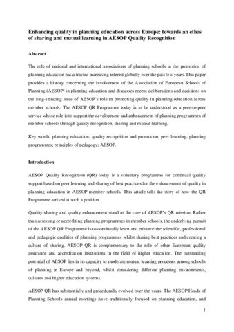 The role of national and international associations of planning schools in the promotion of planning education has attracted increasing interest globally over the past few years. This paper provides a history concerning the involvement of the Association of European Schools of Planning (AESOP) in planning education and discusses recent deliberations and decisions on the long-standing issue of AESOP’s role in promoting quality in planning education across member schools. The AESOP QR Programme today is to be understood as a peer-to-peer service whose role is to support the development and enhancement of planning programmes of member schools through quality recognition, sharing and mutual learning.
