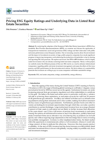 By analyzing the adoption of EPRA’s Sustainability Best Practices Recommendations (sBPR), we examine and discuss the application of transparent Environmental, Social and Governance (ESG) ratings and their interaction with public real estate performance across European markets. Due to increasing concerns about the environment and the impact of investment on society at large, public property companies have made significant progress on improving transparency and enhancing the protection of shareholder value by sharing and reporting ESG best practices. We explore and review the EPRA sBPR database, which is highly useful for investors who are already screening listed real estate companies. Hence, in this project, we carefully study the diffusion process of this new ESG metric as a tool to enhance informational transparency regarding public real estate investment management and assess the effects of this transparency and ESG performance for the real estate stock returns. We find evidence of a sustainability premium that investors are willing to pay to access companies with better sustainable ratings.
