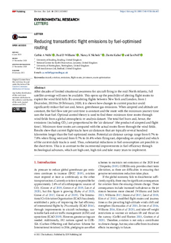 Wells, C. A. orcid id iconORCID: https://orcid.org/0000-0001-9438-4954, Williams, P. D. orcid id iconORCID: https://orcid.org/0000-0002-9713-9820, Nichols, N. K. orcid id iconORCID: https://orcid.org/0000-0003-1133-5220, Kalise, D. orcid id iconORCID: https://orcid.org/0000-0003-2327-1957 and Poll, I. orcid id iconORCID: https://orcid.org/0000-0001-8057-8467 (2021) Reducing transatlantic flight emissions by fuel-optimised routing. Environmental Research Letters, 16 (2). 025002. ISSN 1748-9326 doi: 10.1088/1748-9326/abce82