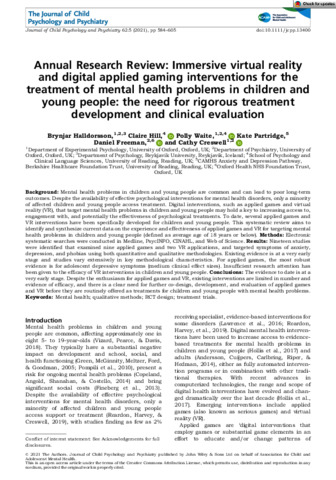 Immersive virtual reality and digital applied gaming interventions for the treatment of mental health problems in children and young people: the need for rigorous treatment development and clinical evaluation.