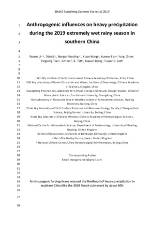 Li, R., Li, D., Nanding, N., Wang, X., Fan, X., Chen, Y., Tian, F., Tett, S. F.B., Dong, B. orcid id iconORCID: https://orcid.org/0000-0003-0809-7911 and Lott, F. C. (2021) Anthropogenic influences on heavy precipitation during the 2019 extremely wet rainy season in Southern China. Bulletin of the American Meteorological Society, 102 (1). S103-S109. ISSN 1520-0477 doi: 10.1175/BAMS-D-20-0135.1 (Li et al. (2021): Anthropogenic influences on heavy precipitation during the 2019 extremely wet rainy season in Southern China. Bull. Amer. Meteor. Soc., S103-S109.)