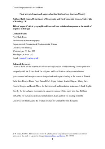 Critical geographies of love and loss: relational responses to the death of a spouse in Senegal.