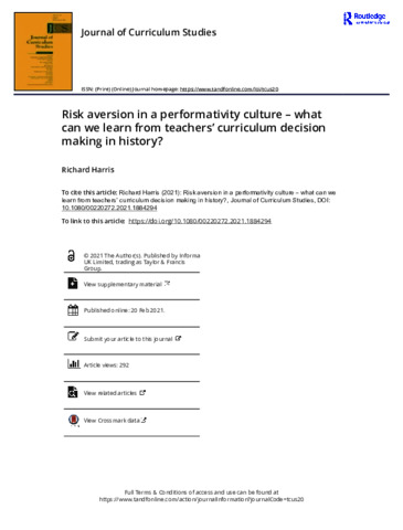 Harris, R. & Reynolds, R. (2018). Exploring teachers’ curriculum decision making: insights from history education. Oxford Review of Education, 44(2), 139-155.