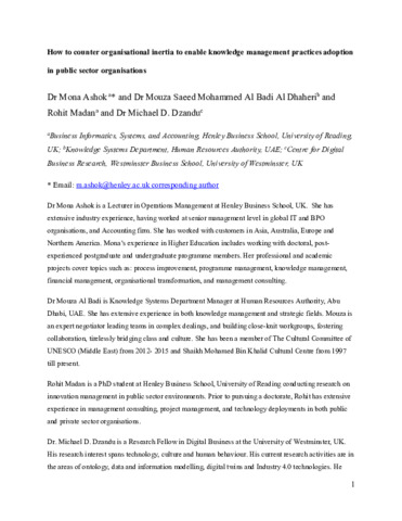 Ashok, M. orcid id iconORCID: https://orcid.org/0000-0002-9827-9104, Al Badi Al Dhaheri, M. S. M., Madan, R. and Dzandu, M. D. (2021) How to counter organisational inertia to enable knowledge management practices adoption in public sector organisations. Journal of Knowledge Management, 25 (9). pp. 2245-2273. ISSN 1367-3270 doi: 10.1108/JKM-09-2020-0700