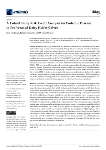Johnson, K. F. orcid id iconORCID: https://orcid.org/0000-0002-5088-1163, Chancellor, N. and Wathes, D. C. (2021) A cohort study risk factor analysis for endemic disease in pre-weaned dairy heifer calves. Animals, 11 (2). e378. ISSN 2076-2615 doi: 10.3390/ani11020378