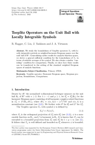 Hagger, R., Liu, C., Taskinen, J. and Virtanen, J. A. (2022) Toeplitz operators on the unit ball with locally integrable symbols. Integral Equations and Operator Theory, 94 (2). 17. ISSN 1420-8989 doi: 10.1007/s00020-022-02695-3
