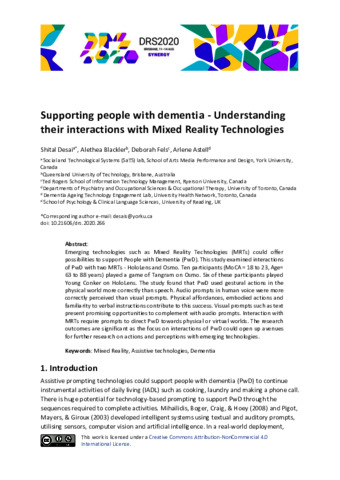 Desai, S., Blackler, A., Fels, D. and Astell, A. orcid id iconORCID: https://orcid.org/0000-0002-6822-9472 (2020) Supporting people with dementia - understanding their interactions with Mixed Reality Technologies. In: DRS2020, 11-14 Aug 2020, Brisbane. doi: 10.21606/drs.2020.266
