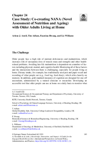 Astell, A. J. orcid id iconORCID: https://orcid.org/0000-0002-6822-9472, Adlam, T., Hwang, F. orcid id iconORCID: https://orcid.org/0000-0002-3243-3869 and Williams, L. (2021) Case study: co-creating NANA (Novel Assessment of Nutrition and Ageing) with older adults living at home. In: Sixsmith, A., Sixsmith, J., Mihailidis, A. and Fang, M. L. (eds.) Knowledge, Innovation & Impact: A Guide for the Engaged Health Researcher. International Perspectives on Social Policy, Administration and Practice. Springer, Cham, Switzerland, pp. 183-186. ISBN 9783030343897 doi: 10.1007/978-3-030-34390-3_24
