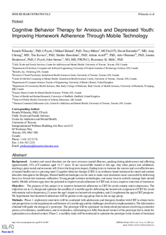 Background: Anxiety and mood disorders are the most common mental illnesses, peaking during adolescence and affecting approximately 25% of Canadians aged 14-17 years. If not successfully treated at this age, they often persist into adulthood, exerting a great social and economic toll. Given the long-term impact, finding ways to increase the success and cost-effectiveness of mental health care is a pressing need. Cognitive behavior therapy (CBT) is an evidence-based treatment for mood and anxiety disorders throughout the lifespan. Mental health technologies can be used to make such treatments more successful by delivering them in a format that increases utilization. Young people embrace technologies, and many want to actively manage their mental health. Mobile software apps have the potential to improve youth adherence to CBT and, in turn, improve outcomes of treatment. Objective: The purpose of this project is to improve homework adherence in CBT for youth anxiety and/or depression. The objectives are to (1) design and optimize the usability of a mobile app for delivering the homework component of CBT for youth with anxiety and/or depression, (2) assess the app’s impact on homework completion, and (3) implement the app in CBT programs. We hypothesize that homework adherence will be greater in the app group than in the no-app group. Methods: Phase 1: exploratory interviews will be conducted with adolescents and therapists familiar with CBT to obtain views and perspectives on the requirements and features of a usable app and the challenges involved in implementation. The information obtained will guide the design of a prototype. The prototype will be optimized via think-aloud procedures involving an iterative process of evaluation, modification, and re-evaluation, culminating in a fully functional version of the prototype that is ready for optimization in a clinical context. Phase 2: a usability study will be conducted to optimize the prototype in the context of treatmentat clinics that provide CBT treatment for youth with anxiety and/or depression. This phase will result in a usable app that is ready to be tested for its effectiveness in increasing homework adherence. Phase 3: a pragmatic clinical trial will be conducted at several clinics to evaluate the impact of the app on homework adherence. Participants in the app group are expected to show greater homework completion than those in the no-app group. Results: Phase 3 will be completed by September 2019. Conclusions: The app will be a unique adjunct to treatment for adolescents in CBT, focusing on both anxiety and depression, developed in partnership with end users at every stage from design to implementation, customizable for different cognitive profiles, and designed with depression symptom tracking measures for youth made interoperable with electronic medical records.