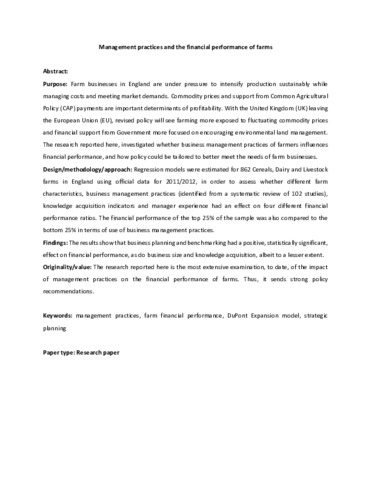 Purpose: Farm businesses in England are under pressure to intensify production sustainably while managing costs and meeting market demands. Commodity prices and support from Common Agricultural Policy (CAP) payments are important determinants of profitability. With the United Kingdom (UK) leaving the European Union (EU), revised policy will see farming more exposed to fluctuating commodity prices and financial support from Government more focused on encouraging environmental land management. The research reported here, investigated whether business management practices of farmers influences financial performance, and how policy could be tailored to better meet the needs of farm businesses. Design/methodology/approach: Regression models were estimated for 862 Cereals, Dairy and Livestock farms in England using official data for 2011/2012, in order to assess whether different farm characteristics, business management practices (identified from a systematic review of 102 studies), knowledge acquisition indicators and manager experience had an effect on four different financial performance ratios. The financial performance of the top 25% of the sample was also compared to the bottom 25% in terms of use of business management practices. Findings: The results show that business planning and benchmarking had a positive, statistically significant, effect on financial performance, as do business size and knowledge acquisition, albeit to a lesser extent. Originality/value: The research reported here is the most extensive examination, to date, of the impact of management practices on the financial performance of farms. Thus, it sends strong policy recommendations.
