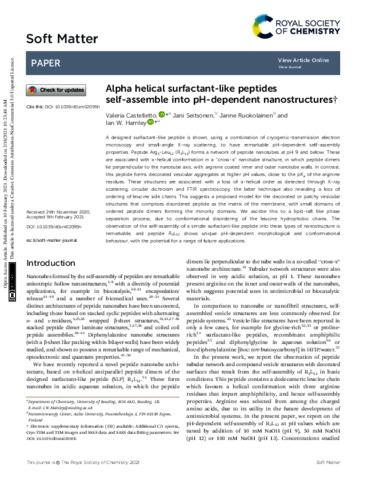 Castelletto, V., Seitsonen, J., Ruokolainen, J. and Hamley, I. W. orcid id iconORCID: https://orcid.org/0000-0002-4549-0926 (2021) Alpha helical surfactant-like peptides self-assemble into pH-dependent nanostructures. Soft Matter, 11. pp. 3096-3104. ISSN 1744-6848 doi: 10.1039/D0SM02095H