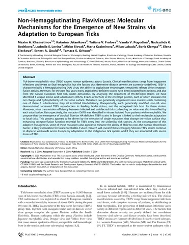 Khasnatinov, M. A., Ustanikova, K., Frolova, T. V., Pogodina, V. V., Bochkova, N. G., Levina, L. S., Slovak, M., Kazimirova, M., Labuda, M., Klempa, B., Eleckova, E., Gould, E. A. and Gritsun, T. S. (2009) Non-hemagglutinating flaviviruses: molecular mechanisms for the emergence of new strains via adaptation to European ticks. PLoS ONE, 4 (10). e7295. ISSN 1932-6203 doi: 10.1371/journal.pone.0007295