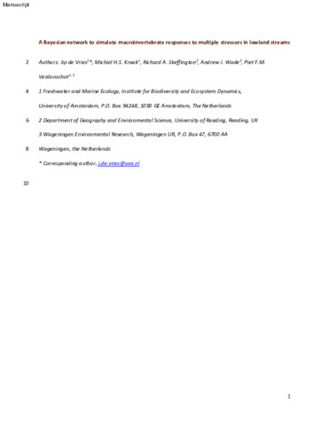de Vries, J., Kraak, M. H. S., Skeffington, R. A., Wade, A. J. orcid id iconORCID: https://orcid.org/0000-0002-5296-8350 and Verdonschot, P. F. M. (2021) A Bayesian network to simulate macroinvertebrate responses to multiple stressors in lowland streams. Water Research, 194. 116952. ISSN 0043-1354 doi: 10.1016/j.watres.2021.116952