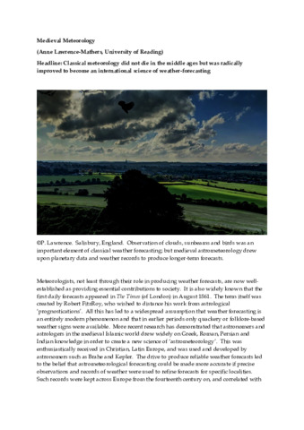 It is widely known that the first daily forecasts appeared in The Times (of London) in August 1861. The term itself was created by Robert FitzRoy, who wished to distance his work from astrological ‘prognostications’. This has led to a widespread assumption that weather forecasting is an entirely modern phenomenon and that in earlier periods only quackery or folklore-based weather signs were available. More recent research has demonstrated that astronomers and astrologers in the medieval Islamic world drew widely on Greek, Roman, Persian and Indian knowledge in order to create a new science of ‘astrometeorology’. This was enthusiastically received in Christian, Latin Europe, and was used and developed by astronomers such as Brahe and Kepler. The drive to produce reliable weather forecasts led to the belief that astrometeorological forecasting could be made more accurate if precise observations and records of weather were used to refine forecasts for specific localities. Such records were kept across Europe from the fourteenth century on, and correlated with forecasts made by astronomical methods. This article surveys the history of this science.