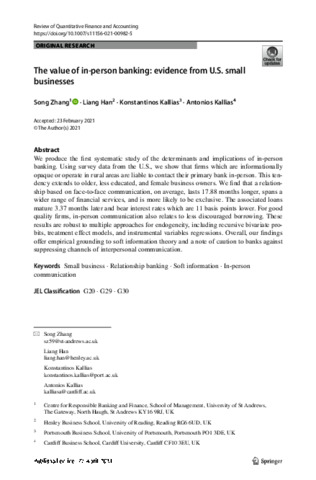 Zhang, S., Han, L. orcid id iconORCID: https://orcid.org/0000-0002-2778-3338, Kallias, K. and Kallias, A. (2021) The value of in-person banking: evidence from U.S. small businesses. Review of Quantitative Finance and Accounting, 57. pp. 1393-1435. ISSN 1573-7179 doi: 10.1007/s11156-021-00982-5