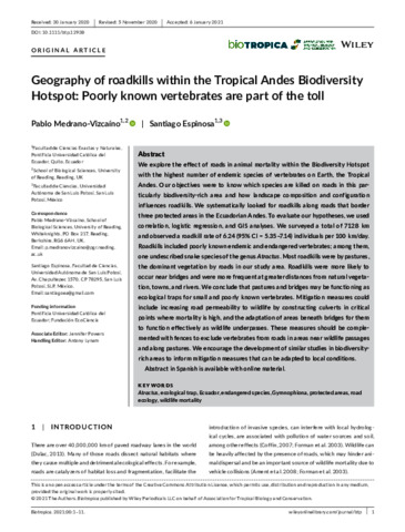 Medrano-Vizcaíno, P. and Espinosa, S. (2021) Geography of roadkills within the Tropical Andes Biodiversity Hotspot: poorly known vertebrates are part of the toll. Biotropica, 53 (3). pp. 820-830. ISSN 1744-7429 doi: 10.1111/btp.12938
