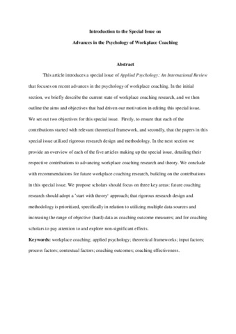This article introduces a special issue of Applied Psychology: An International Review that focuses on recent advances in the psychology of workplace coaching. To begin with, we briefly describe the current state of workplace coaching research, and we then outline the aims and objectives that had driven our motivation in editing this special issue. We set out two objectives for this special issue. First, to ensure that each of the contributions started with the relevant theoretical framework, and secondly, that the papers in this special issue utilized rigorous research design and methodology. We then provide an overview of each of the five articles making up the special issue, detailing their respective contributions to advancing workplace coaching research and theory. We conclude with recommendations for future workplace coaching research, building on the contributions in this special issue. We propose scholars should focus on three key areas: future coaching research should adopt a “start with theory” approach; that rigorous research design and methodology is prioritized, specifically in relation to utilizing multiple data sources and increasing the range of objective (hard) data as coaching outcome measures; and for coaching scholars to pay attention to and explore non‐significant effects.