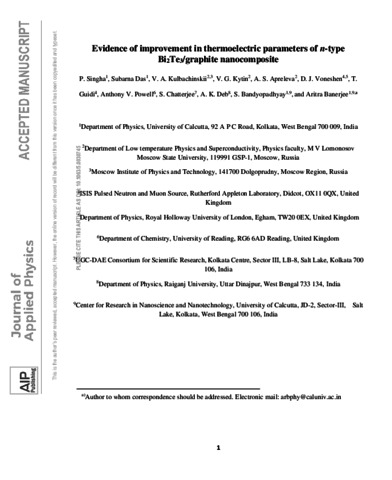 Singha, P., Das, S., Kulbachinskii, V. A., Kytin, V. G., Apreleva, A.S., Voneshen, D. J., Guidi, T., Powell, A. V., Chatterjee, S., Deb, A. K., Bandyopadhyay, S. and Benerjee, A. (2021) Evidence of improvement in thermoelectric parameters of n-type Bi2Te3/graphite nanocomposite. Journal of Applied Physics, 129 (5). 055108. ISSN 0021-8979 doi: 10.1063/5.0030745