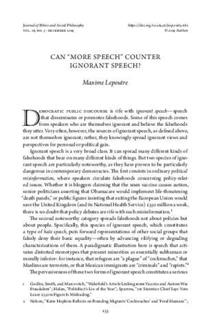 Ignorant speech, which spreads falsehoods about people and policies, is pervasive in public discourse. A popular response to this problem recommends countering ignorant speech with more speech, rather than legal regulations. However, Mary Kate McGowan has influentially argued that this ‘counterspeech’ response is flawed, as it overlooks the asymmetric pliability of conversational norms: the phenomenon whereby some conversational norms are easier to enact than subsequently to reverse. After demonstrating that this conversational ‘stickiness’ is an even broader concern for counterspeech than McGowan suggests—it applies not just to oppressive or hateful speech, but also to ordinary policy-related misinformation—I argue that a more sophisticated account of counterspeech can nevertheless overcome it. First, the stickiness objection overlooks the distinction between ‘negative’ and ‘positive’ counterspeech. Instead of directly negating a distorted proposition, positive counterspeech affirms a correct proposition that is inconsistent with the falsehoods at hand. This, I contend, allows it to counter ignorant speech without triggering the properties that render it sticky. Second, the stickiness objection presupposes an unrefined conception of counterspeech’s temporality. Counterspeech should be understood as a diachronic process, which not only follows, but also pre-empts, ignorant utterances. Drawing on speech-act theories of silencing, I argue that pre-emptive counterspeech can condition the conversational context so as to prevent subsequent ignorant utterances from enacting sticky conversational norms. Thus, this theoretically-refined conception of counterspeech helps appreciate how verbal responses might overcome the stickiness of conversational norms; and, in doing so, it reveals that this stickiness need not provide reasons to prefer legal remedies to counterspeech.