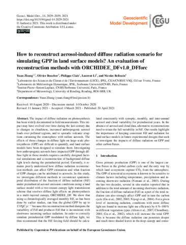 Zhang, Y., Boucher, O., Ciais, P., Li, L. and Bellouin, N. orcid id iconORCID: https://orcid.org/0000-0003-2109-9559 (2021) How to reconstruct diffuse radiation scenario for simulating GPP in land surface models? An evaluation of reconstruction methods with ORCHIDEE_DFv1.0_DFforc. Geoscientific Model Development, 14 (4). pp. 2029-2039. ISSN 1991-9603 doi: 10.5194/gmd-14-2029-2021