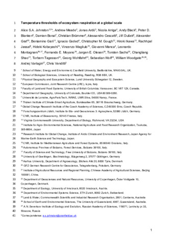 Johnston, A. S. A. orcid id iconORCID: https://orcid.org/0000-0001-8781-4039, Meade, A. orcid id iconORCID: https://orcid.org/0000-0001-7095-7711, Ardö, J. orcid id iconORCID: https://orcid.org/0000-0002-9318-0973, Arriga, N. orcid id iconORCID: https://orcid.org/0000-0001-5321-3497, Black, A., Blanken, P. D. orcid id iconORCID: https://orcid.org/0000-0002-7405-2220, Bonal, D. orcid id iconORCID: https://orcid.org/0000-0001-9602-8603, Brümmer, C. orcid id iconORCID: https://orcid.org/0000-0001-6621-5010, Cescatti, A., Dušek, J. orcid id iconORCID: https://orcid.org/0000-0001-6119-0838, Graf, A. orcid id iconORCID: https://orcid.org/0000-0003-4870-7622, Gioli, B. orcid id iconORCID: https://orcid.org/0000-0001-7631-2623, Goded, I. orcid id iconORCID: https://orcid.org/0000-0002-1912-325X, Gough, C. M. orcid id iconORCID: https://orcid.org/0000-0002-1227-7731, Ikawa, H., Jassal, R. orcid id iconORCID: https://orcid.org/0000-0002-6727-5215, Kobayashi, H. orcid id iconORCID: https://orcid.org/0000-0001-9319-0621, Magliulo, V. orcid id iconORCID: https://orcid.org/0000-0001-5505-6552, Manca, G. orcid id iconORCID: https://orcid.org/0000-0002-9376-0310, Montagnani, L. orcid id iconORCID: https://orcid.org/0000-0003-2957-9071, Moyano, F. E. orcid id iconORCID: https://orcid.org/0000-0002-4090-5838, Olesen, J. E. orcid id iconORCID: https://orcid.org/0000-0002-6639-1273, Sachs, T. orcid id iconORCID: https://orcid.org/0000-0002-9959-4771, Shao, C., Tagesson, T. orcid id iconORCID: https://orcid.org/0000-0003-3011-1775, Wohlfahrt, G. orcid id iconORCID: https://orcid.org/0000-0003-3080-6702, Wolf, S. orcid id iconORCID: https://orcid.org/0000-0001-7717-6993, Woodgate, W., Varlagin, A. orcid id iconORCID: https://orcid.org/0000-0002-2549-5236 and Venditti, C. orcid id iconORCID: https://orcid.org/0000-0002-6776-2355 (2021) Temperature thresholds of ecosystem respiration at a global scale. Nature Ecology & Evolution, 5. pp. 487-494. ISSN 2397-334X doi: 10.1038/s41559-021-01398-z