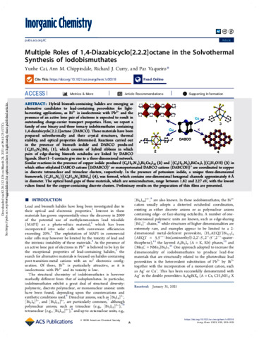 Cai, Y., Chippindale, A. M. orcid id iconORCID: https://orcid.org/0000-0002-5918-8701, Curry, R. J. and Vaqueiro, P. orcid id iconORCID: https://orcid.org/0000-0001-7545-6262 (2021) Multiple roles of 1,4-diazabicyclo[2.2.2]octane in the solvothermal synthesis of iodobismuthates. Inorganic Chemistry, 60 (7). pp. 5333-5342. ISSN 0020-1669 doi: 10.1021/acs.inorgchem.1c00318