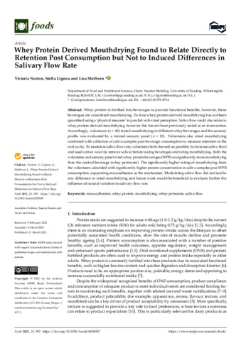 Whey protein is fortified into beverages to provide functional benefits, however, these beverages are considered mouthdrying. To date whey protein derived mouthdrying has not been quantified using a ‘physical measure’ in parallel with rated perception. Saliva flow could also relate to whey protein derived mouthdrying, however this has not been previously tested as an intervention. Accordingly, volunteers (n = 40) tested mouthdrying in different whey beverages and the sensory profile was evaluated by a trained sensory panel (n = 10). Volunteers also rated mouthdrying combined with collection of saliva samples post beverage consumption to measure retention to the oral cavity. To modulate saliva flow rate, volunteers both chewed on parafilm (to increase saliva flow) and used cotton wool (to remove saliva) before tasting beverages and rating mouthdrying. Both the volun-teers and sensory panel rated whey protein beverages (WPB) as significantly more mouthdrying than the control beverage (whey permeate). The significantly higher rating of mouthdrying from the volunteers coincided with significantly higher protein concentration in saliva samples post WPB consumption, supporting mucoadhesion as the mechanism. Modulating saliva flow did not lead to any difference in rated mouthdrying and future work would be beneficial to evaluate further the influence of natural variation in salivary flow rate.